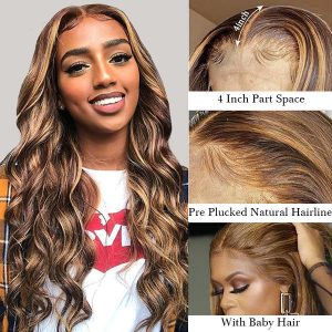 New In 4/27 Brown Colored Highlight Wig Transparent T Part Wig Honey Blonde Highlight Color Wig